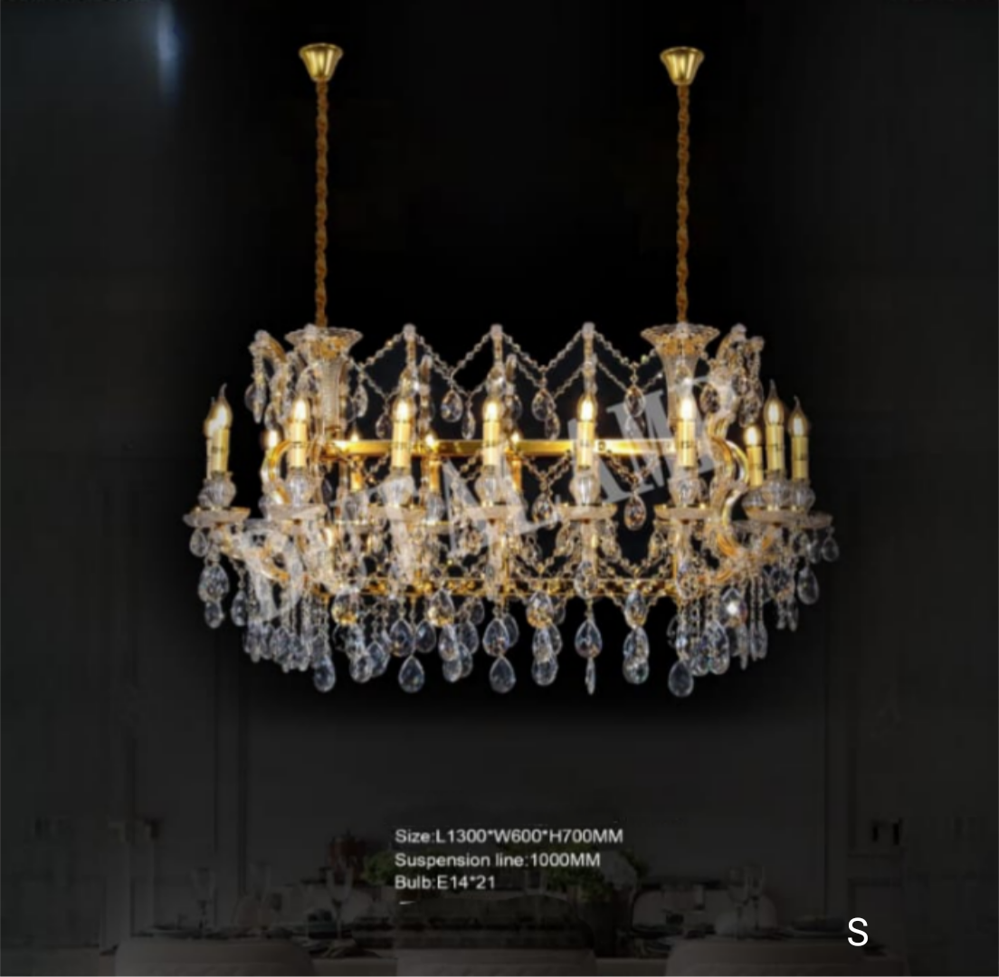 Crystal chandelier above rectangle dining table